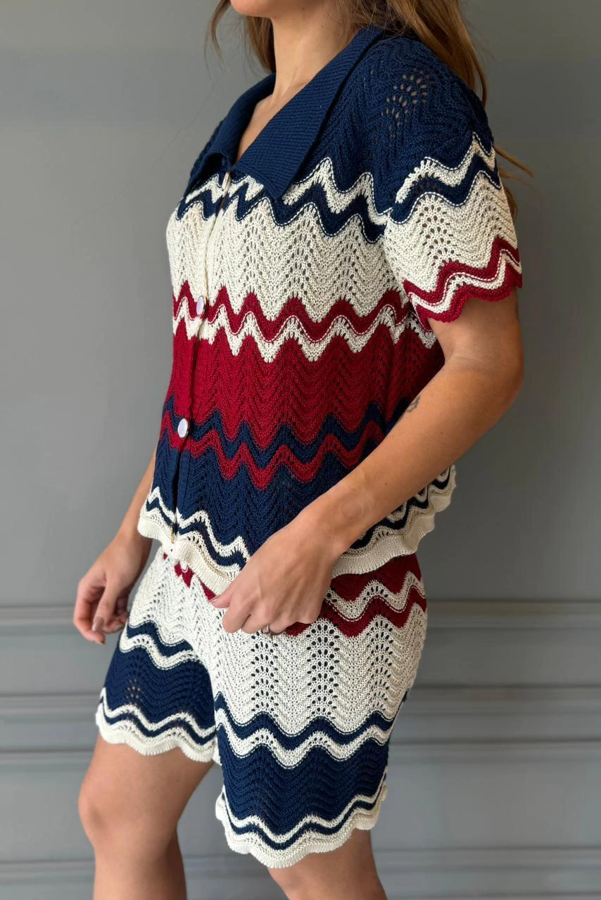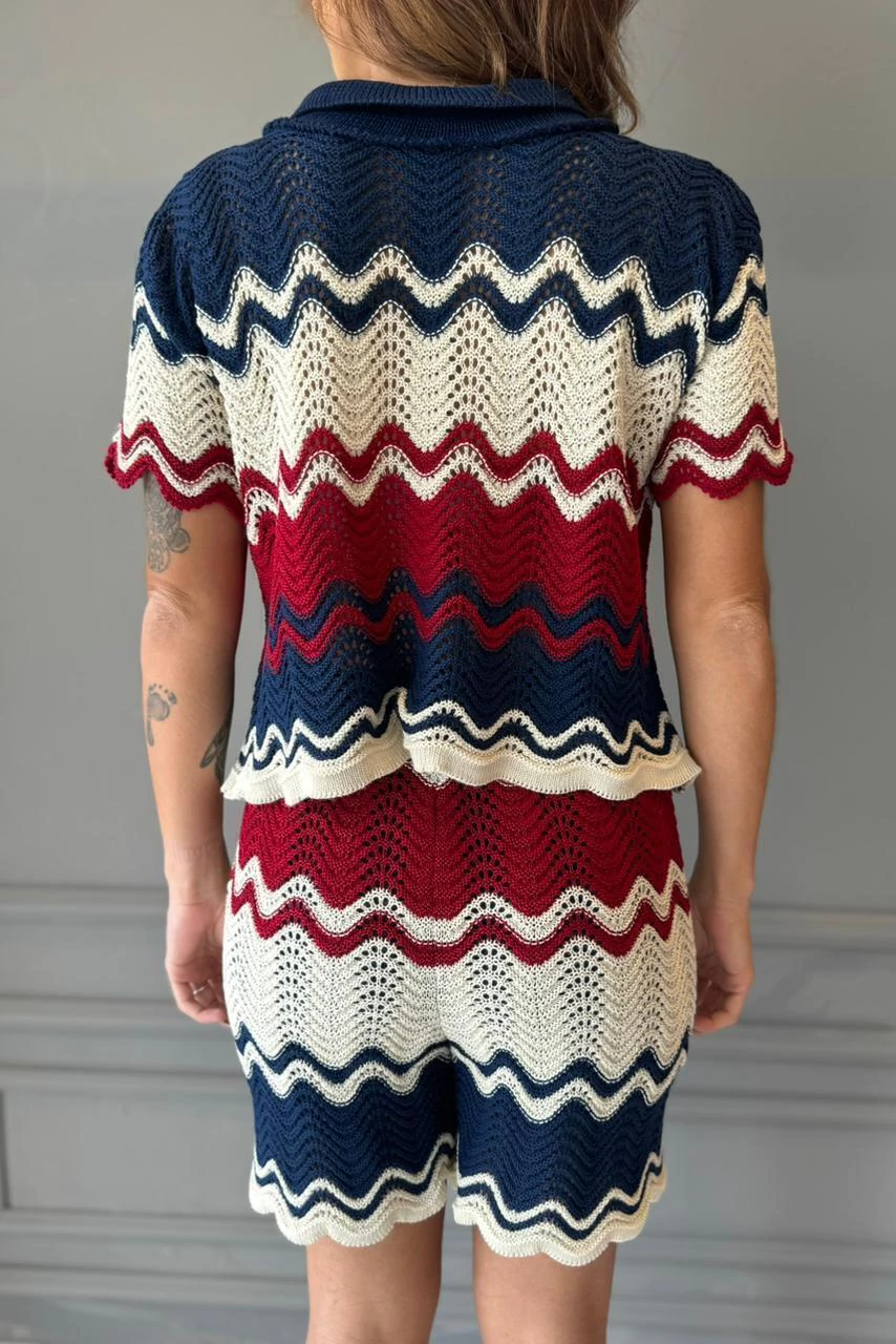 O CONJUNTO BLUSA E SHORTS EM TRICOT é puro charme e estilo! Feito em tricot leve e confortável, ele traz uma padronagem ondulada nas cores azul-marinho, off white e vermelho. Um clássico com toque moderno.