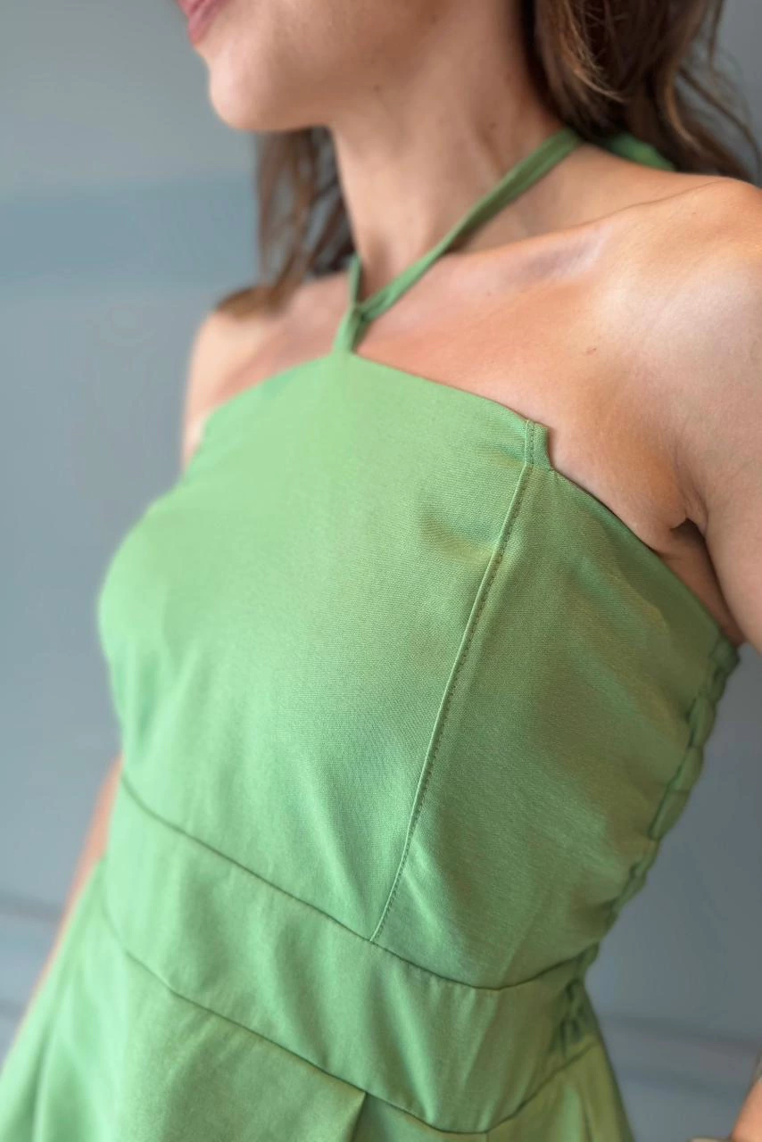O top possui decote reto com amarração no pescoço (estilo halter), que valoriza os ombros e alonga a silhueta. A parte de trás é finalizada com lastex, garantindo ajuste perfeito ao corpo e total conforto. A barra levemente peplum cria um efeito delicado e feminino.