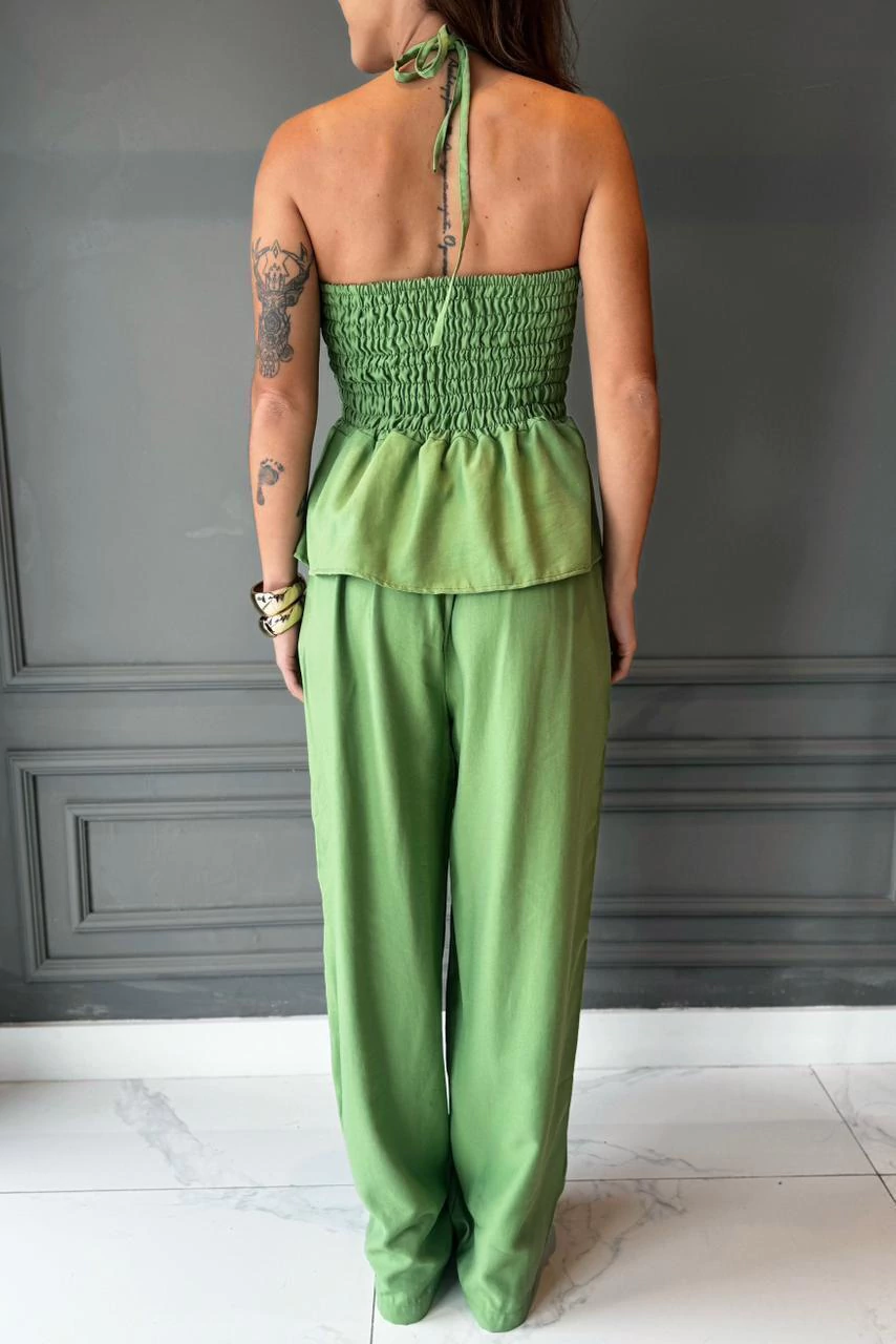 O Conjunto Verde com Amarração no Pescoço é a escolha ideal para quem busca um look leve, moderno e sofisticado sem abrir mão do conforto. Composto por top e calça, ele traz uma proposta fresh e versátil que transita facilmente do dia para a noite.