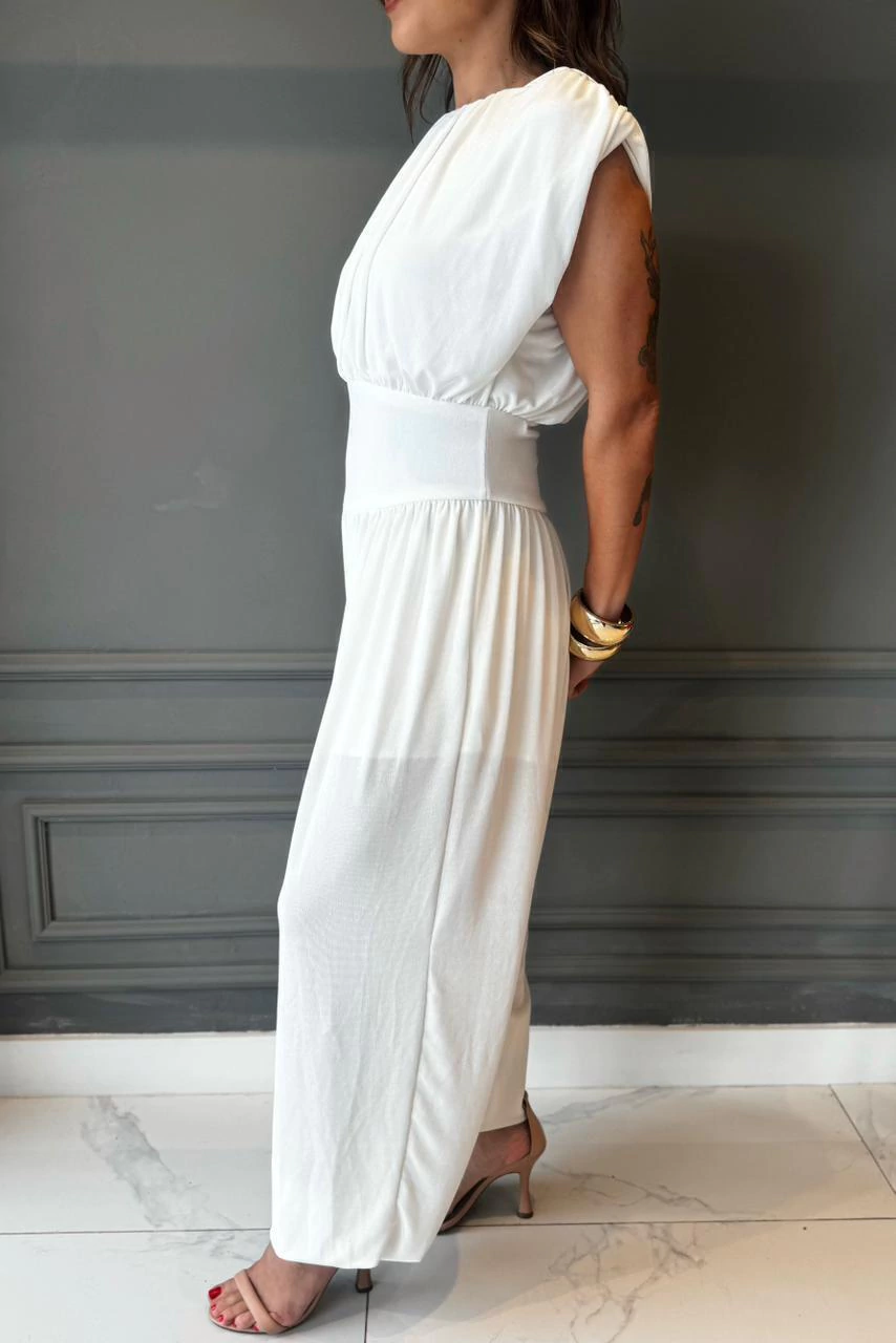 O modelo apresenta gola drapeada com leve franzido, valorizando o colo de forma delicada. Na parte de trás, o decote em gota com amarração adiciona charme e feminilidade. A cintura marcada realça a silhueta, enquanto a calça de modelagem ampla e fluida proporciona movimento e conforto ao andar.
