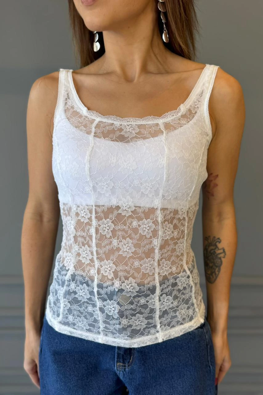 A Regata de Renda Feminina Branca é sinônimo de delicadeza e elegância. Confeccionada em renda floral com transparência leve, ela traz um toque romântico e sofisticado para o look.