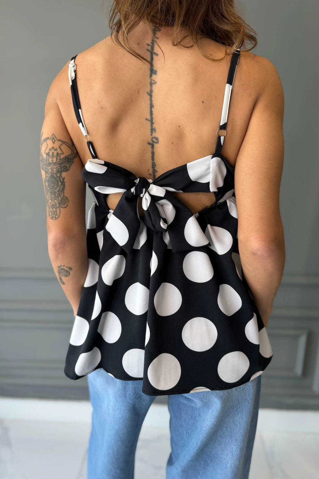 A estampa clássica de poá traz um toque atemporal, enquanto o detalhe nas costas garante modernidade e delicadeza. Perfeita para compor produções casuais com jeans ou looks mais sofisticados com saias e calças de alfaiataria.