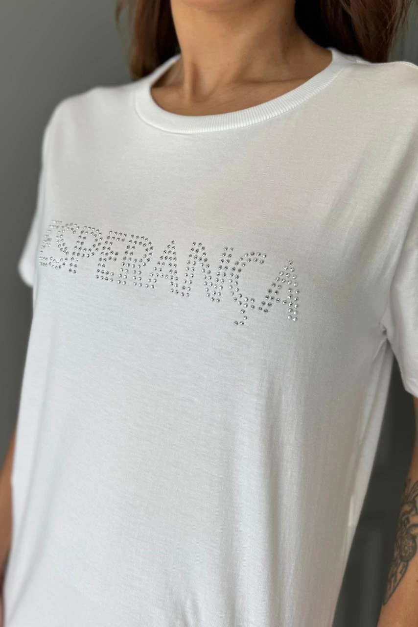 Confeccionada em malha leve e macia, traz a palavra “Esperança” aplicada em strass na parte frontal — um toque de brilho sutil e inspirador para o dia a dia.